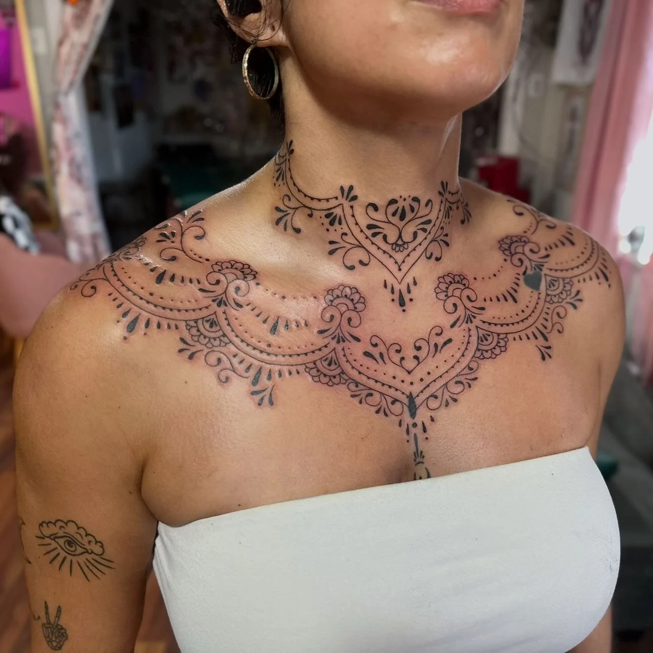 View fullsize All in one go 🔥 This client took this custom neck and chest piece like a champ! This is definitely the kind of tattoo that makes you feel like a new person. Still have a couple spots left in October! Books currently open through December. Website in